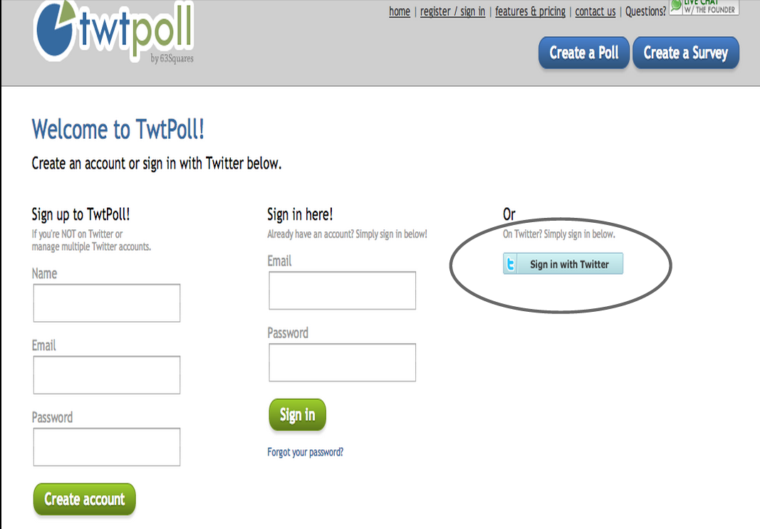 STEP 2: Register for Twtpoll with your e-mail or authorize the Twitter app and wait to be redirected to Twtpoll to start creating your first poll/survey.