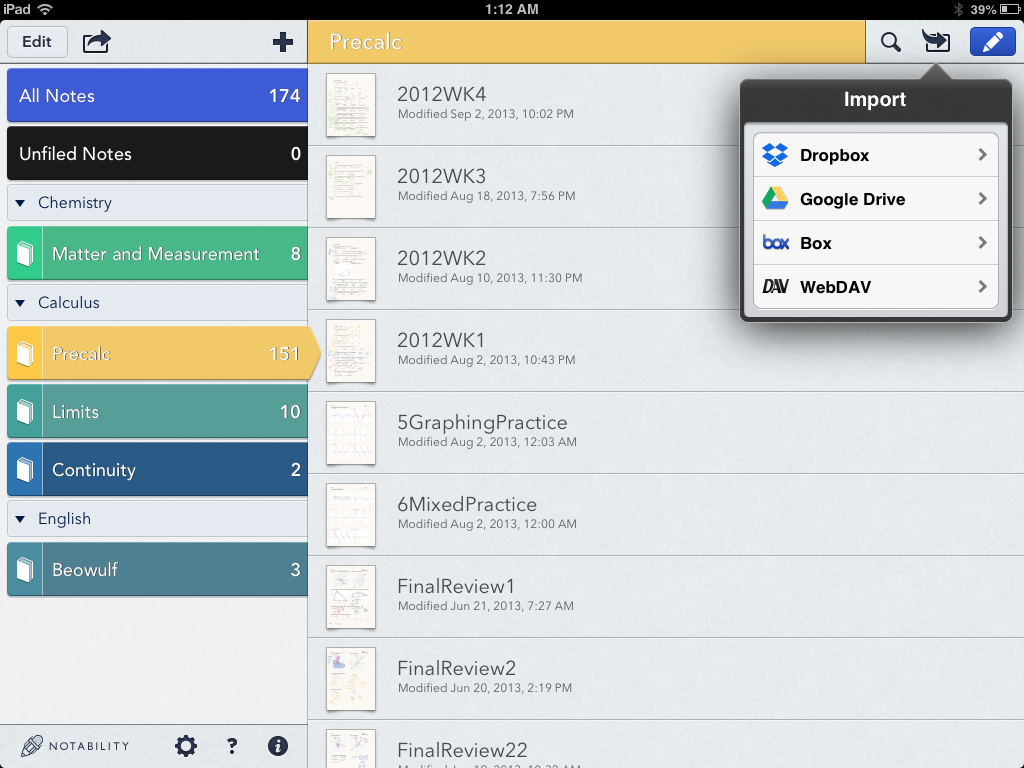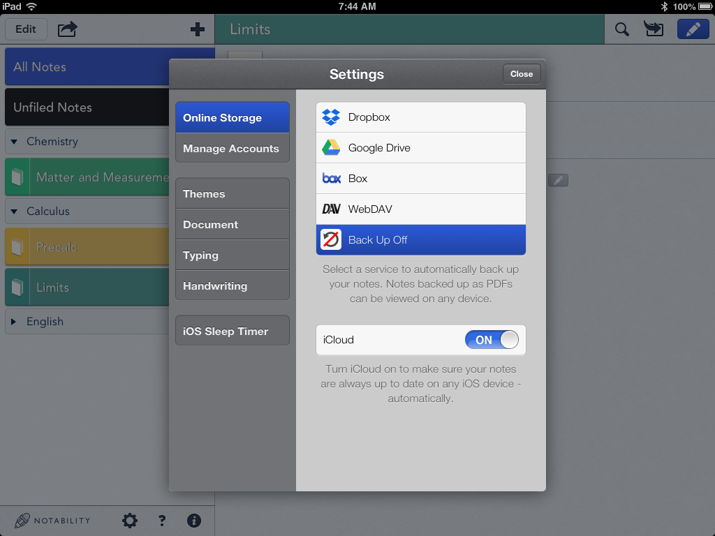 Notability can also backup notes on the internet to iCloud, Google Drive, Drop Box, WebDAV, and Box. So in case you forget your iPad one day with last night’s homework on it, you can use a friend’s iPad to access your homework or notes online.
