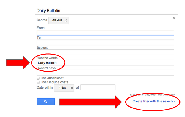 Step 2: A window will appear that will allow you to specify your search criteria and apply a filter. Let’s say you want to apply a filter to the BHS Daily Bulletin. Type “Daily Bulletin” in the “Has the words” box and click on “create filter with this search” on the bottom right.