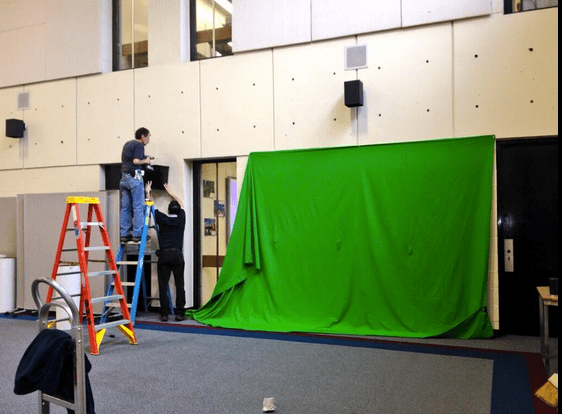 The BHS custodial crew adds the green screen to the Lower Library