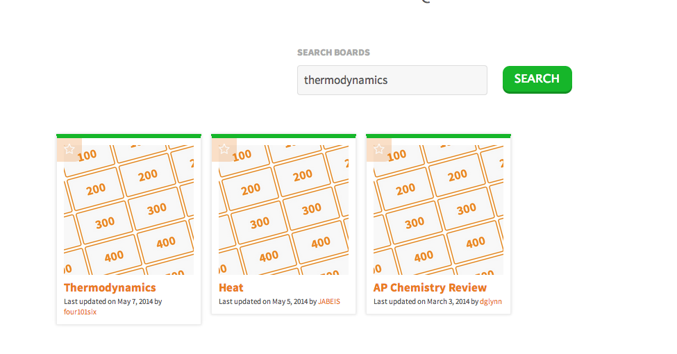 When you click on “Search & Discover” you will find that you will have the option to view hundreds of game boards created by other users. On this page, the most popular boards can be seen and you can also search for more boards with specific keywords. For example, if you’re a Chemistry teacher and are looking for a board on thermodynamics, just type in the search box “Thermodynamics”