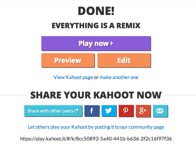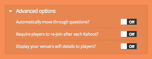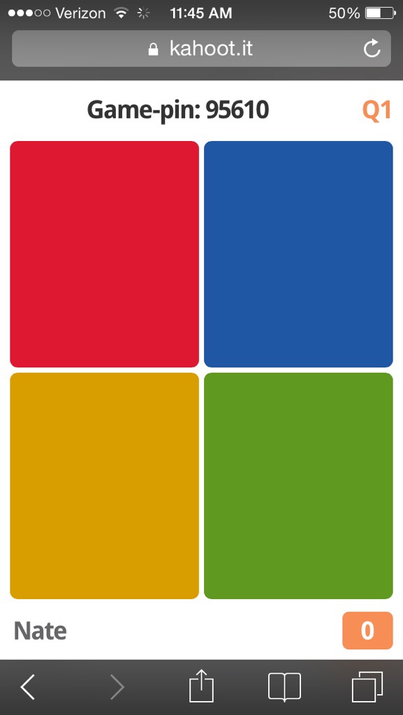 Creating a quiz in Kahoot is a simple process. Teachers select “quiz,” give their quiz a title and start building questions and answers. Questions are limited to 95 characters and responses are limited to 60 characters. Teachers simply click on the correct response and that answer will get marked as correct and turns green, while the remaining responses will be marked incorrect and are red. Once the quiz has been created, teachers are taken to a screen where they can easily rearrange the order of the questions. Next, teachers select the settings for their quiz. Teachers select which language they want for the quiz (there are 24 languages to choose from), whether it is public or private, and the primary audience (school, university, business, training, event, or social). Teachers can also describe the quiz, use tags, and set the difficulty level to either beginner, intermediate, or advanced. Finally, teachers can select a cover image for their quiz. One of the experimental features that’s in beta is embedding a YouTube video to be displayed in the background of the “lobby screen” as players join the game. Once teachers have selected all of their settings, they select “done” and are ready to share their quiz. Kahoots can be shared with students via social media through Facebook, Twitter, Pinterest, Google+, or email. Teachers can also select “play now” and students will be able to start playing the game right away. Teachers have several options for game play including randomizing the order of answers and playing music in the lobby while players are joining the game. There are also several advanced options including showing players the details of your wifi network.