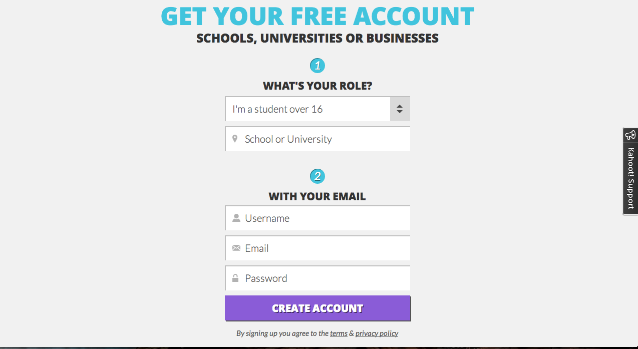 Teachers create a free account by selecting their role (teacher) and entering the name of their school. Next, teachers provide their email, select a username and password and click “create account.”