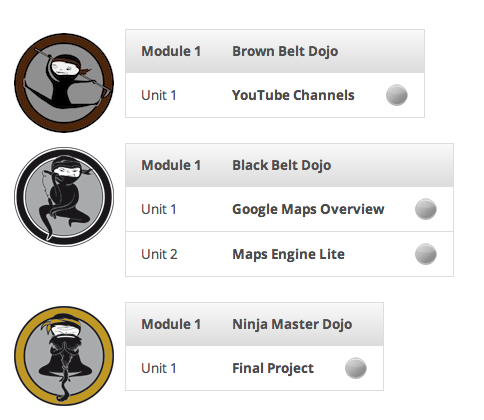 Sign up is free and easy and students can get started right away working on each module. Below are screenshots from the Ninja Program site with an overview of the units within each module. I’m excited to see BHS students (and hopefully Marshall Simonds Middle School Students) become certified Google Ninja’s! Any teacher who wishes to complete the program may do so also…I just pass my Drive test and earned my Yellow Belt!