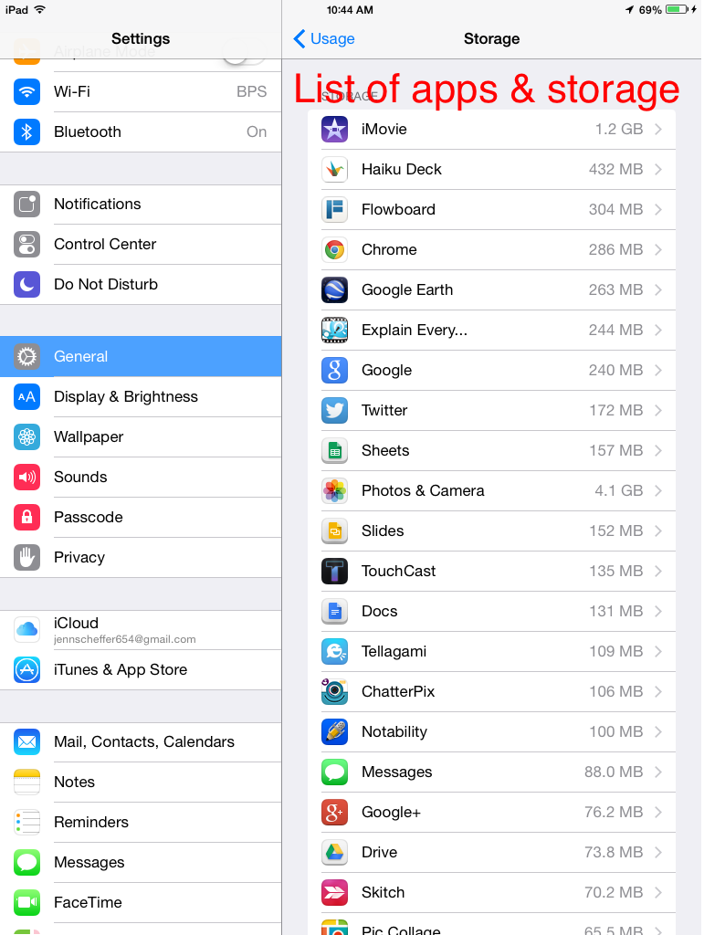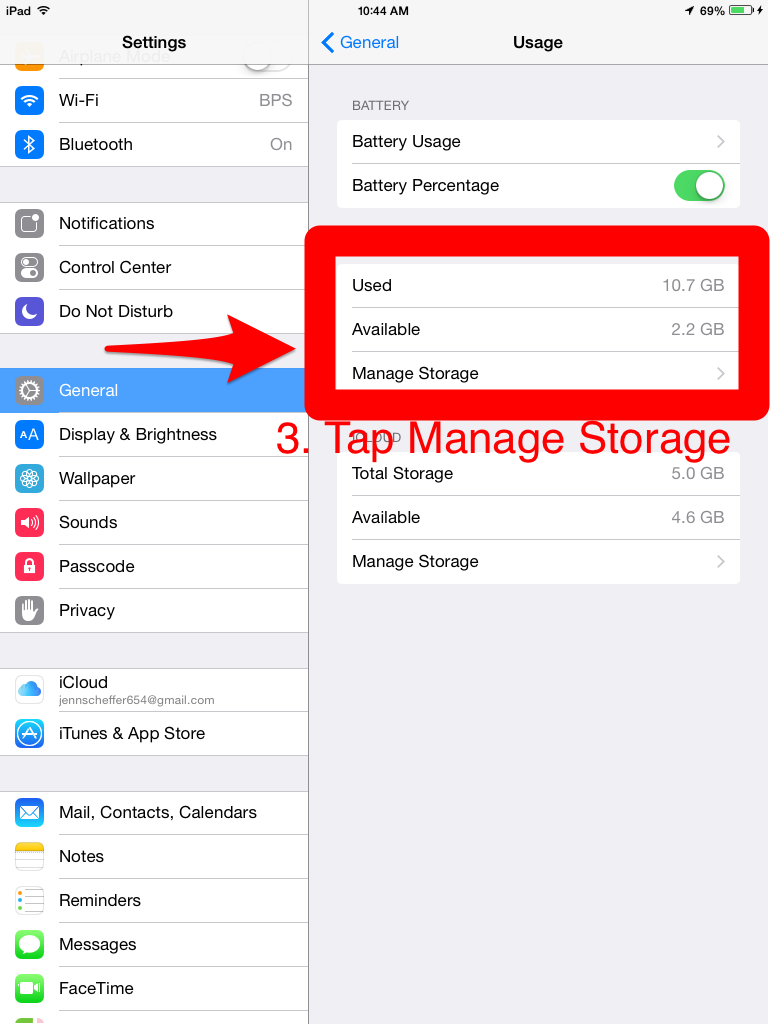 When you are ready to update, you may receive a notification that you do not have enough space on your device. If this is the case, you can check the amount of storage each of your apps is taking up on your device. Chances are, your photos, videos, or music are the culprits of your limited storage, so you’ll want to back them up through iCloud and then delete them from your device to have sufficient space for the iOS 8.1 update. Below are screenshots that walk you through how to find your storage area on your iPad. First go to Settings, the follow the screenshots below.