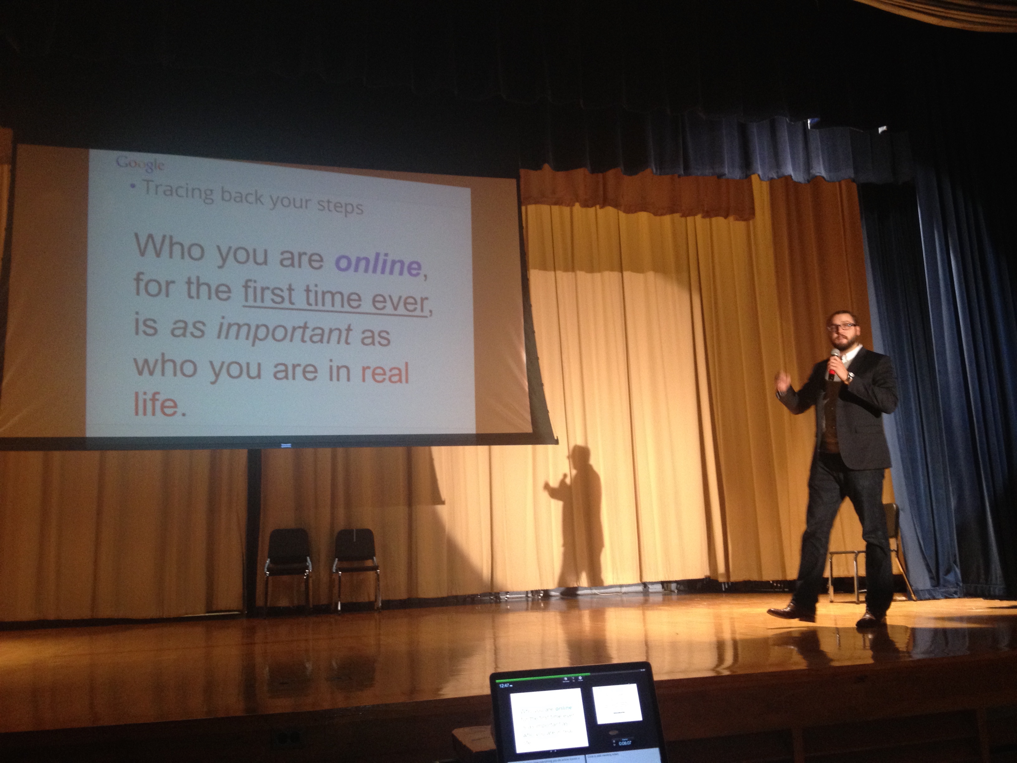 His advice to parents during morning breakfast was to learn the social media tools their children are using (check out the Parent Resource page on our blog for a valuable collection of resources). He encouraged parents to engage in open and honest conversations about the type of digital footprints their sons and daughters may be creating with tools like Twitter, Instagram, and Snapchat. He advised parents to do “spring cleaning” with their children’s social media accounts. In other words, take the time to sit down with their children, take the “Google yourself challenge” and remove negative or inappropriate digital content. And rather than have no digital presence at all, Michael urged parents to help their children use free technology tools including Google+, LinkedIn, and Blogger to create a digital brand that would impress a college admissions representative or future employer. It’s now common practice for employers to Google search applicants, and it’s important students learn at a young age how to represent themselves in our digital world in a positive way. His message to the high school students was similar.