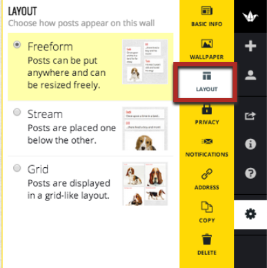 5. There are three layout choices for how posts appear on your wall. Freeform allows posts to go anywhere and can be easily resized. The stream layout allows posts to be placed below one another and grid posts are displayed in a grid-like layout. The grid layout is recommended if you are going to have a lot of posts and wish to keep your wall organized and aesthetically pleasing.