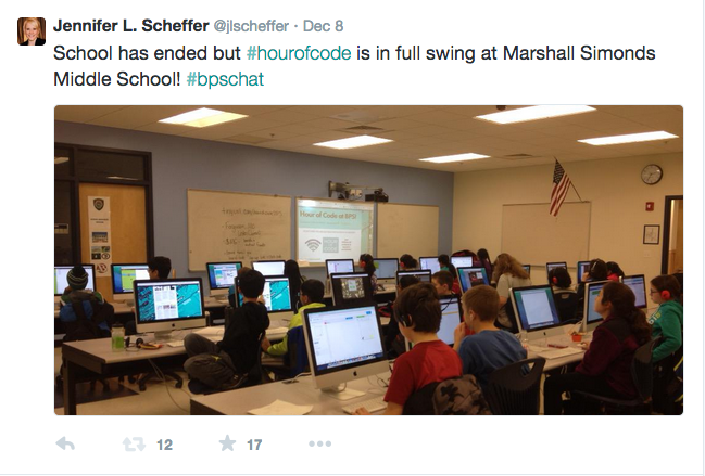During the week of coding in Burlington, students also realized the amount of testing and trial and error involved in creating a successful program. This was especially evident last Thursday when I visited Jill Cuhna and Valerie Doherty’s third graders at Pine Glen. Throughout their Hour of Code, most students worked in teams of two to four helping each other progress through each level of Lightbot. Jill, Valerie, and I offered our assistance to the 26 third graders in the room, but for the most part, students were helping each other without any adult intervention. In fact, there were a few levels of Lightbot that students helped me complete! When Hour of Code was over and indoor recess began, the majority of the students chose to continue with Lightbot (this happened in first grade classrooms as well). To see students sacrifice recess to code was another highlight of the week. Similarly, Marshall Simonds Middle School students also chose to give up their leisure time to embark on an Hour of Code.