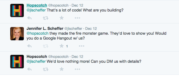I was invited back to her class on Friday so students could show me the progress they had made since the lesson on Monday. I was amazed at the advanced level of coding these novice programmers had accomplished. Students had discovered the Hopscotch emojis, created full-blown fire-ball monster games to play on their iPads, and wowed me with their dancing turkeys. After Tweeting out a picture of several student programs, Hopscotch commented stating, “that’s a lot of code! What did they make?” Our Twitter conversation continued briefly and resulted in a Live Google Hangout On Air (embedded below) which allowed students to speak directly with Alish Ermanshare, who created many of the Hopscotch Hour of Code video tutorials, as well as Ian Frye who handles their social media. Students showcased their creations directly with the folks at Hopscotch and to say they were impressed is a massive understatement! “That was an experience they will never forget,” stated Lynne.