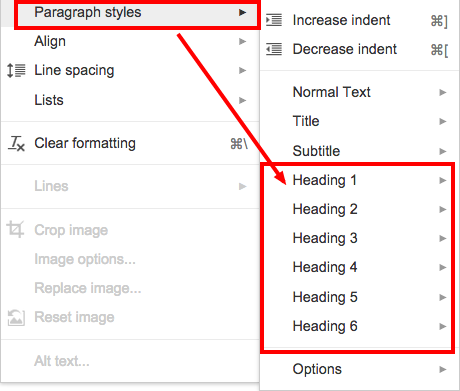 1. Ensure the sections of your document that you wish to appear in the table of contents are formatted with a heading style. To do this, go to the format menu, select paragraph styles and then choose from one of six heading styles for your document.