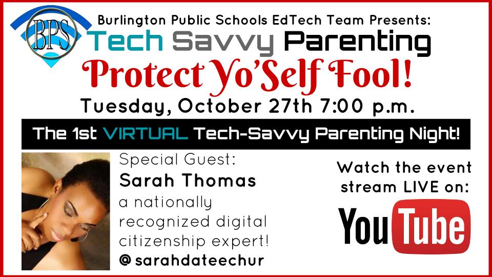This month, BPS parents can watch the event streaming live, from any Internet connected device, via YouTube from the comfort of their own homes! Parents who are unable to watch live can view the video archive at their convenience. For October’s event, we will be discussing the important topic of cyber security. We are thrilled to have Sarah Thomas (Virginia), a nationally recognized digital citizenship expert, leading this critical conversation. Sarah will be sharing her information-rich and highly entertaining “Protect Yo’Self Fool!” presentation. She will help parents understand how to provide their children with the benefits of the Internet, while still ensuring a safe, ethical, and responsible experience. She’ll also discuss privacy issues surrounding educational applications. Read more about Sarah here: